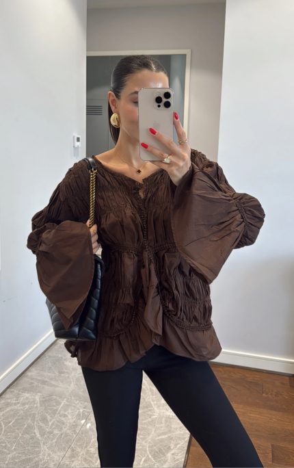 Brown Frill Detailed Pleated Shirt