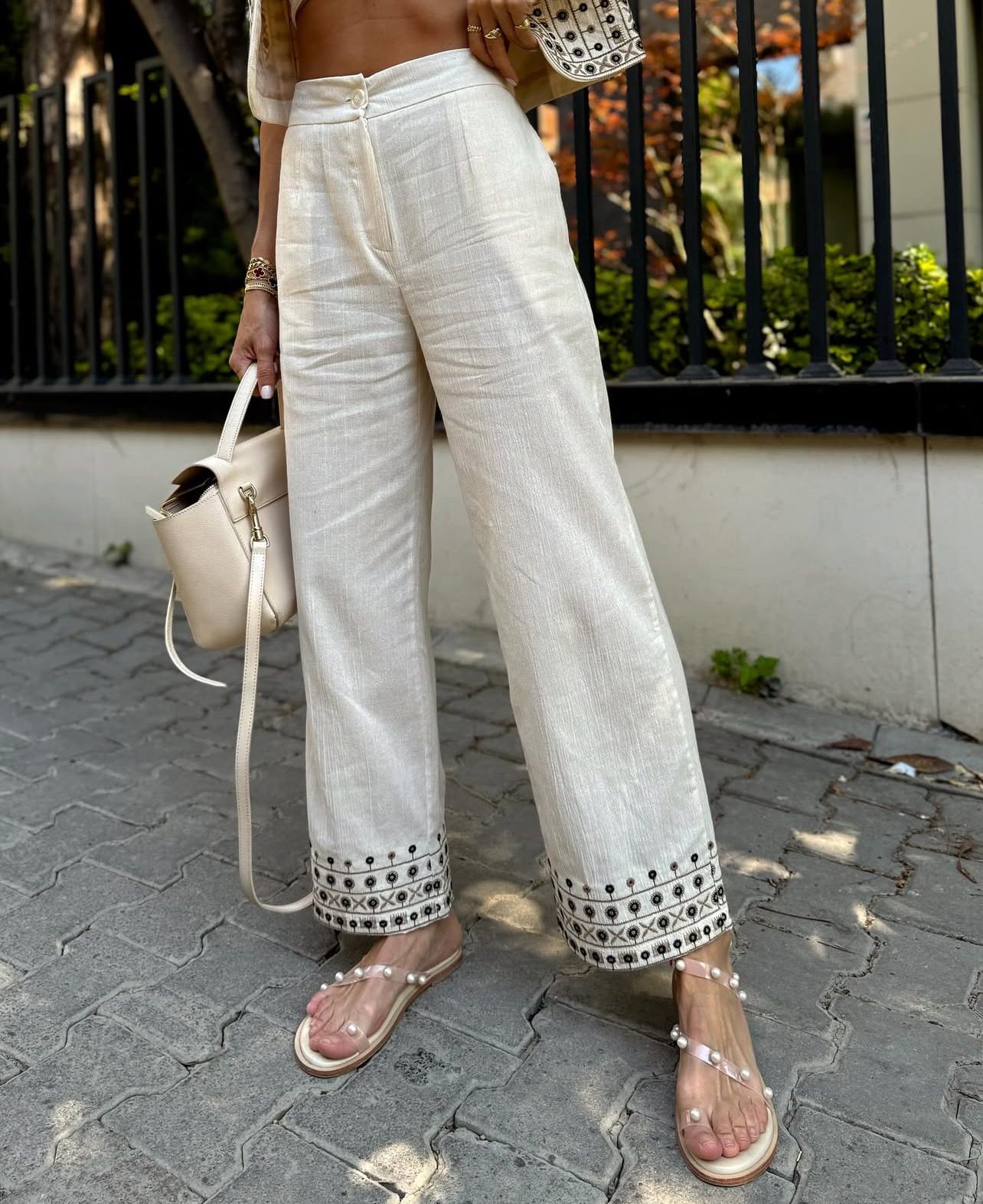 Linen Embroidered Vest Set – Beige