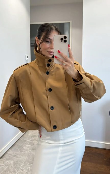 High Collar Buttoned Trnech Coat-Camel